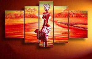 African Girl, Sunset Painting, Canvas Painting, African Woman Painting, 5 Piece Canvas Art, Abstract Wall Painting-Paintingforhome