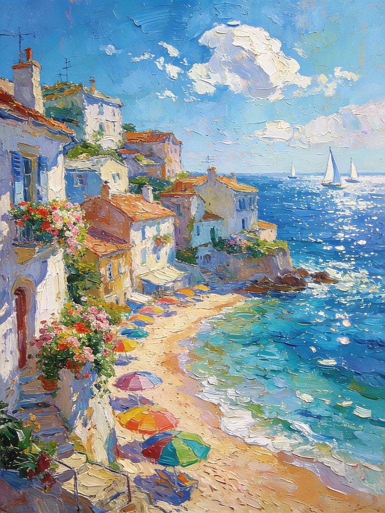 Azure Days - A Summer Holiday on the Mediterranean, Landscape Oil Paintings, Impasto Wall Art Paintings, Original Small Paintings on Canvas, Heavy Texture Oil Paintings, Small Paintings on Canvas