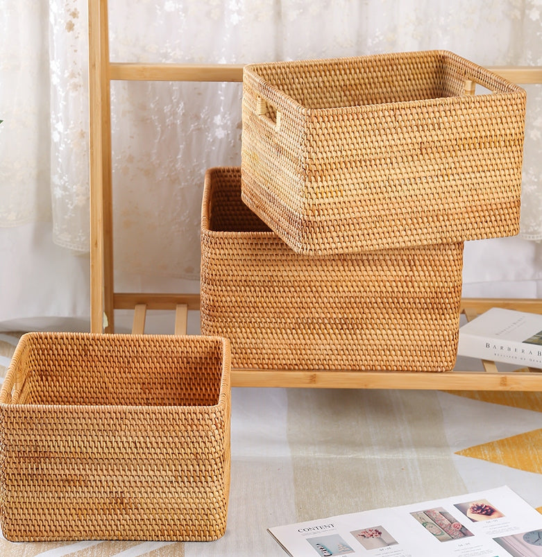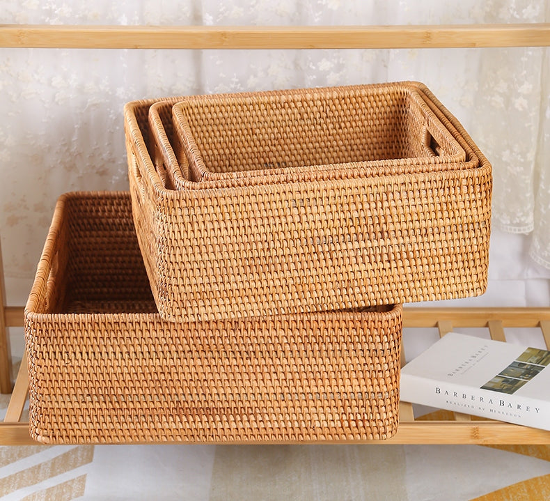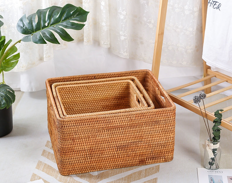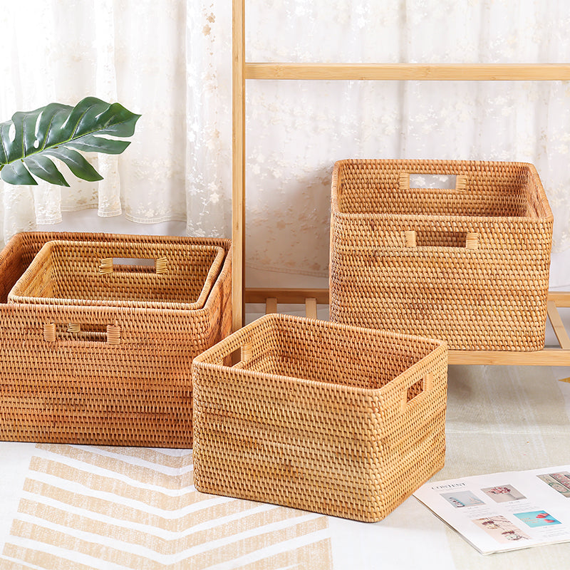 Rectangle Woven Basket with Handle, Vietnam Traditional Handmade Rattan Wicker Storage Basket
