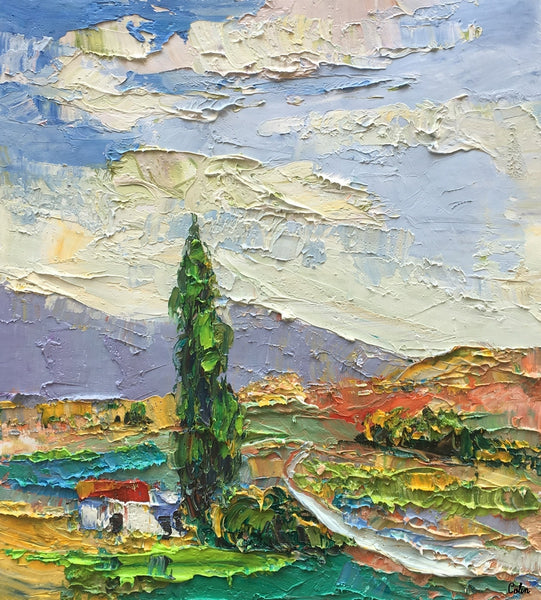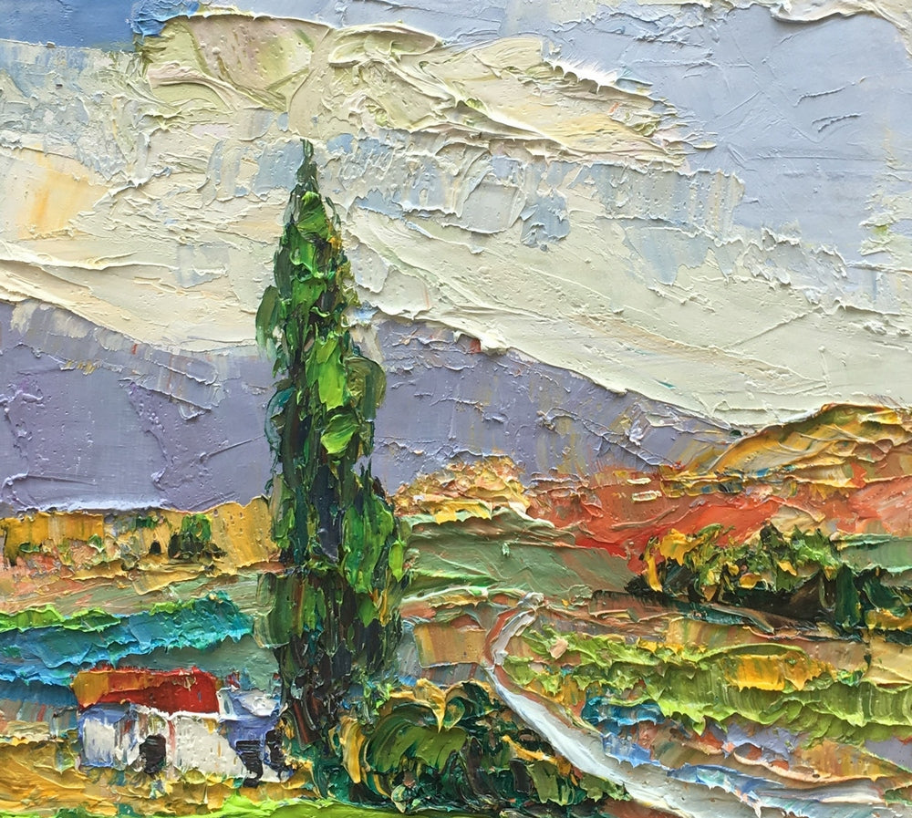 Landscape Painting, Cypress Tree Painting, Small Oil Painting, Heavy Texture Oil Painting
