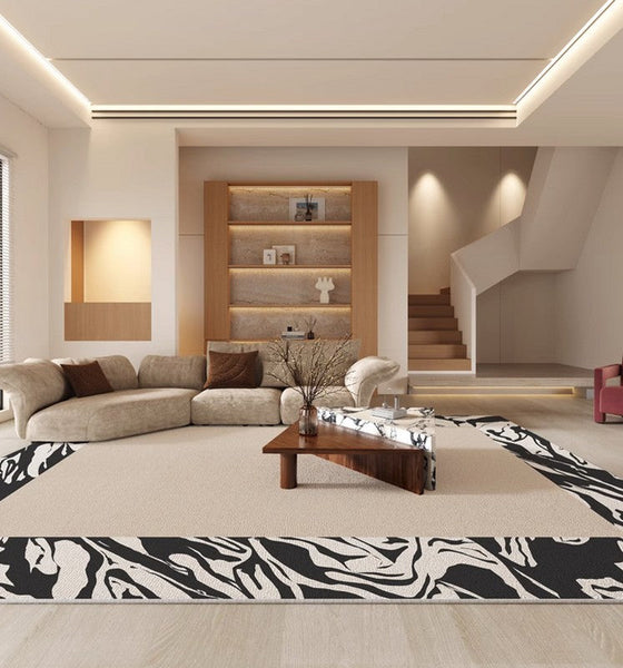 Modern Rugs for Dining Room, Modern Rugs for Living Room, Contemporary Modern Rugs, Black Stripe Abstract Contemporary Rugs Next to Bed