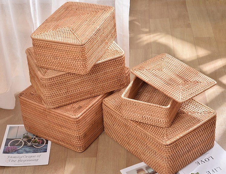 Rectangular Woven Basket with Lid, Extra Large Woven Rattan Storage Basket for Bedroom, Rattan Storage Baskets, Storage Baskets for Shelves, Storage Baskets for Clothes