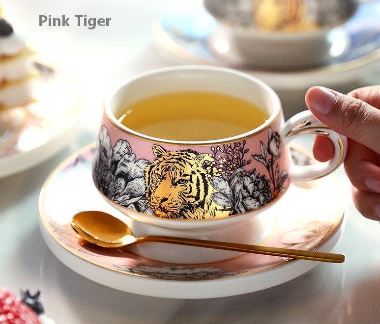Creative Ceramic Tea Cup and Saucer, Jungle Tiger Cheetah Porcelain Coffee Cups, Unique Ceramic Cups with Gold Trim and Gift Box-Paintingforhome